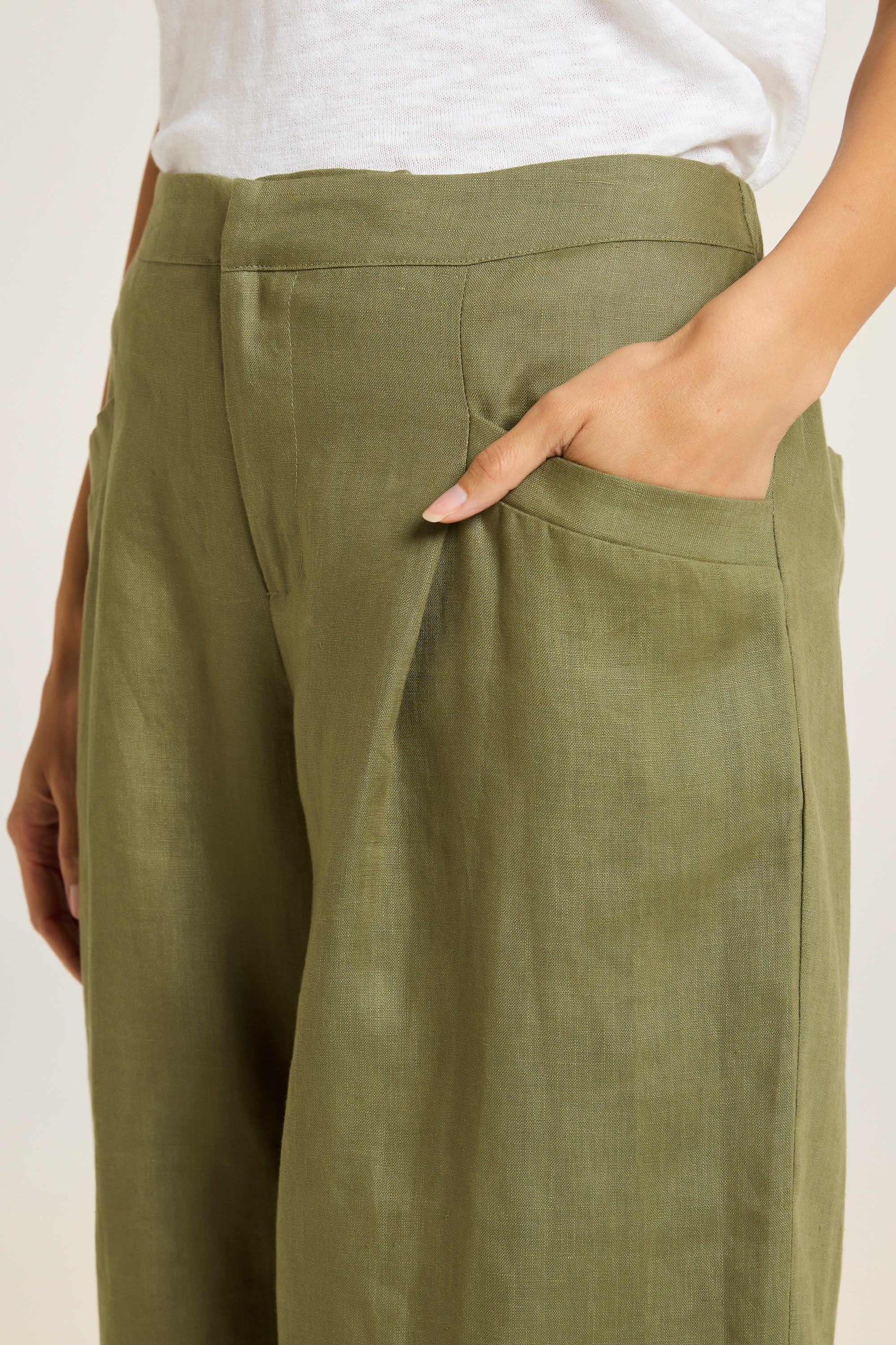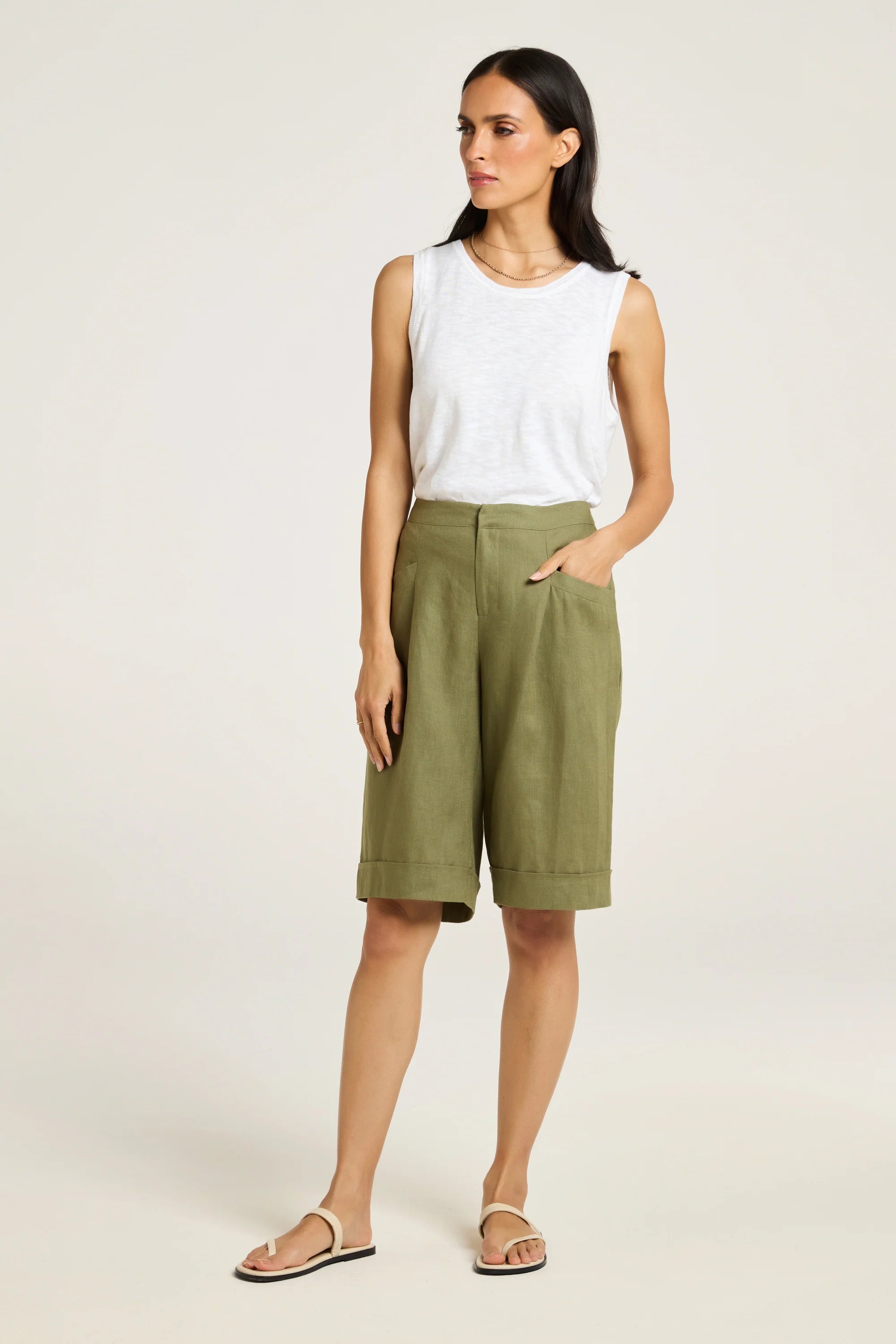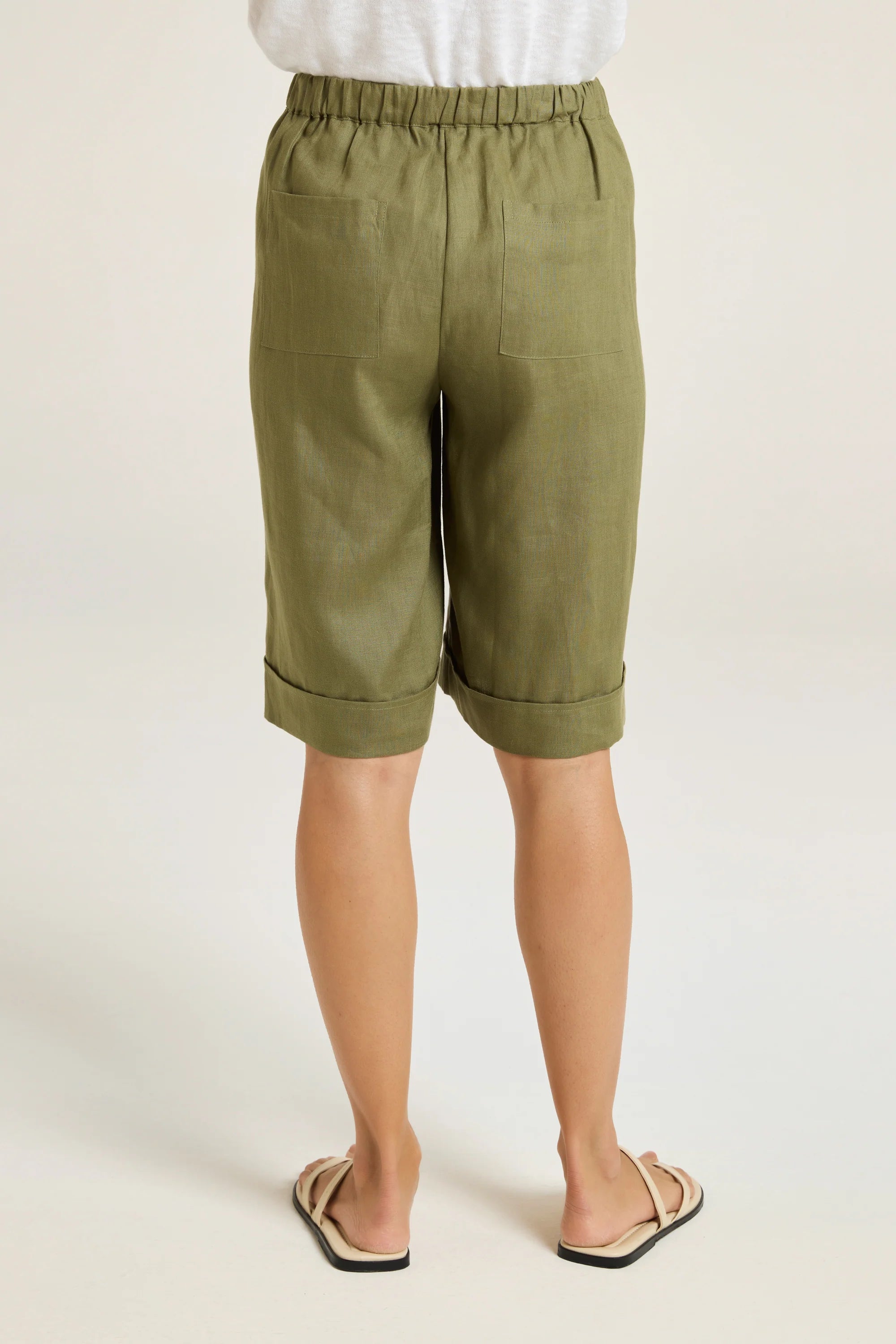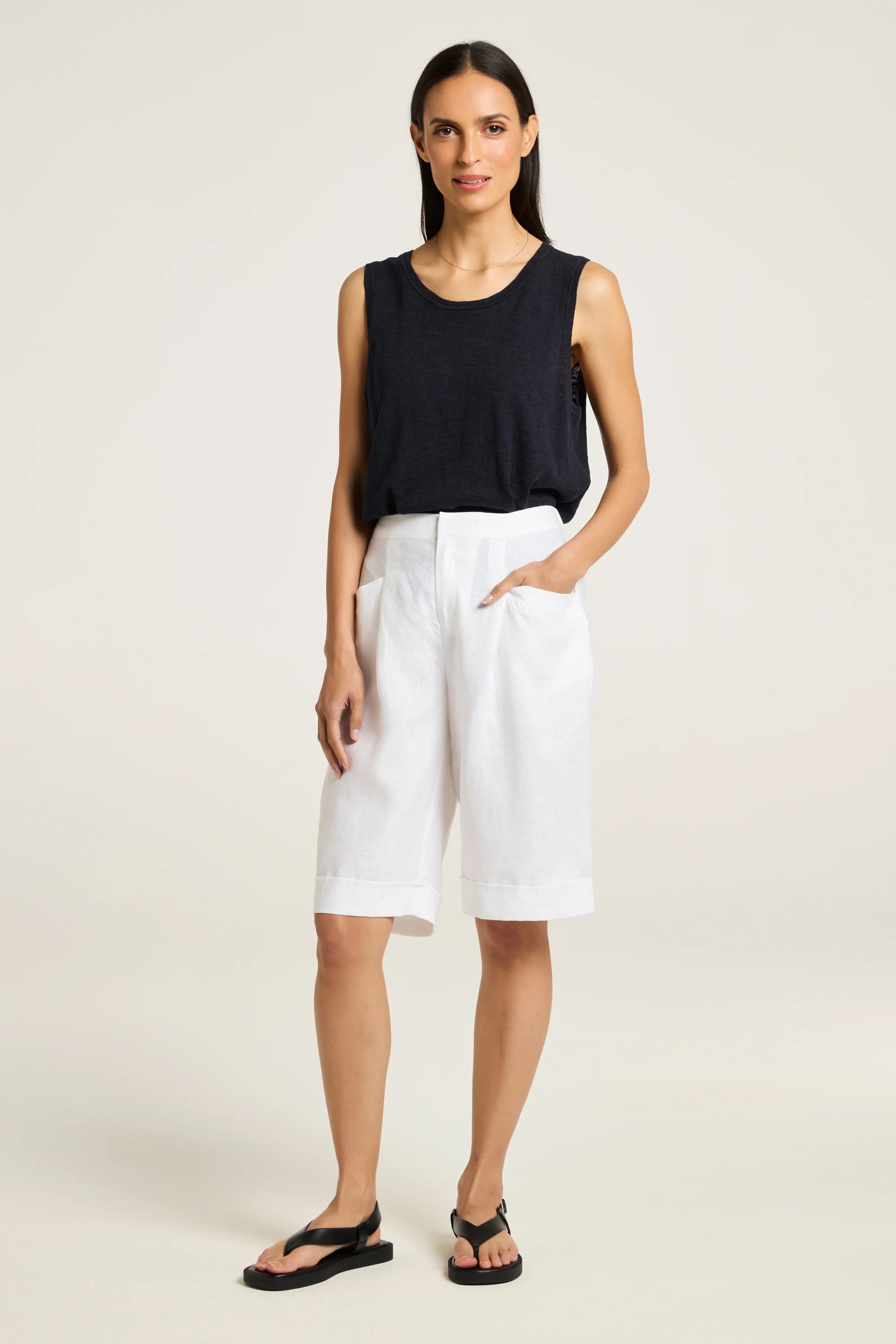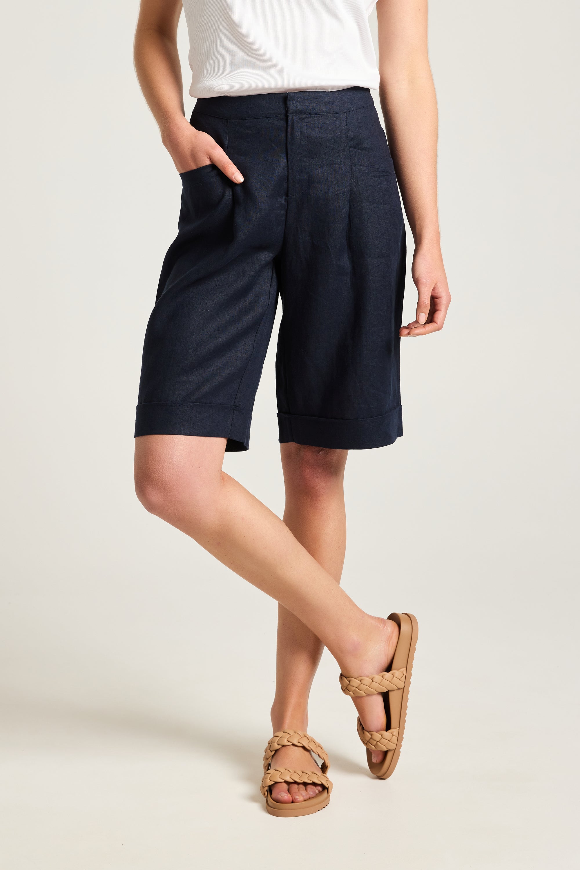 Upgrade your summer wardrobe with our playful Bermuda shorts! Made from 100% linen, they offer a modern touch with front pleats and angled pockets. The half-elasticated waistband and back patch pockets provide the perfect balance of style and functionality.