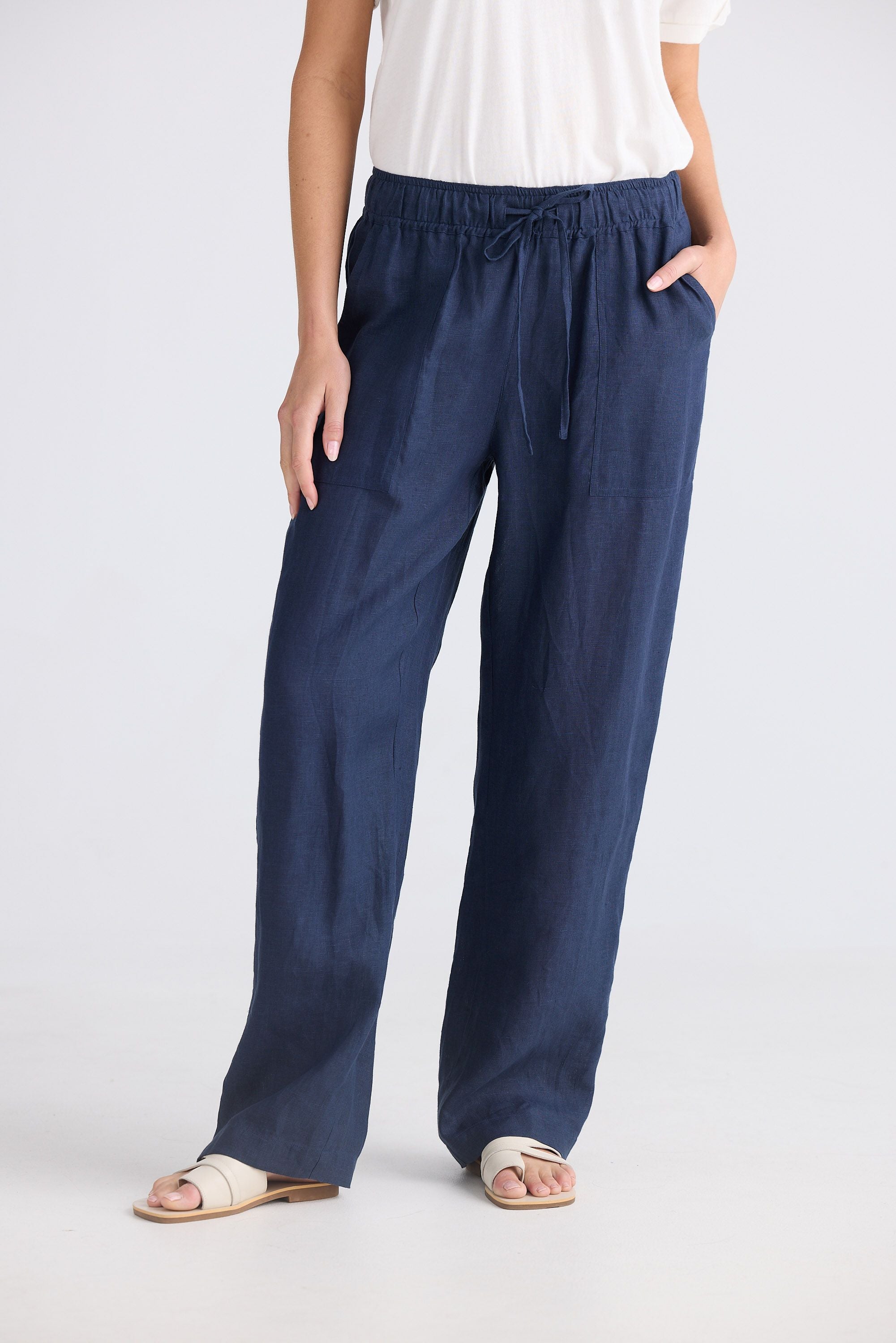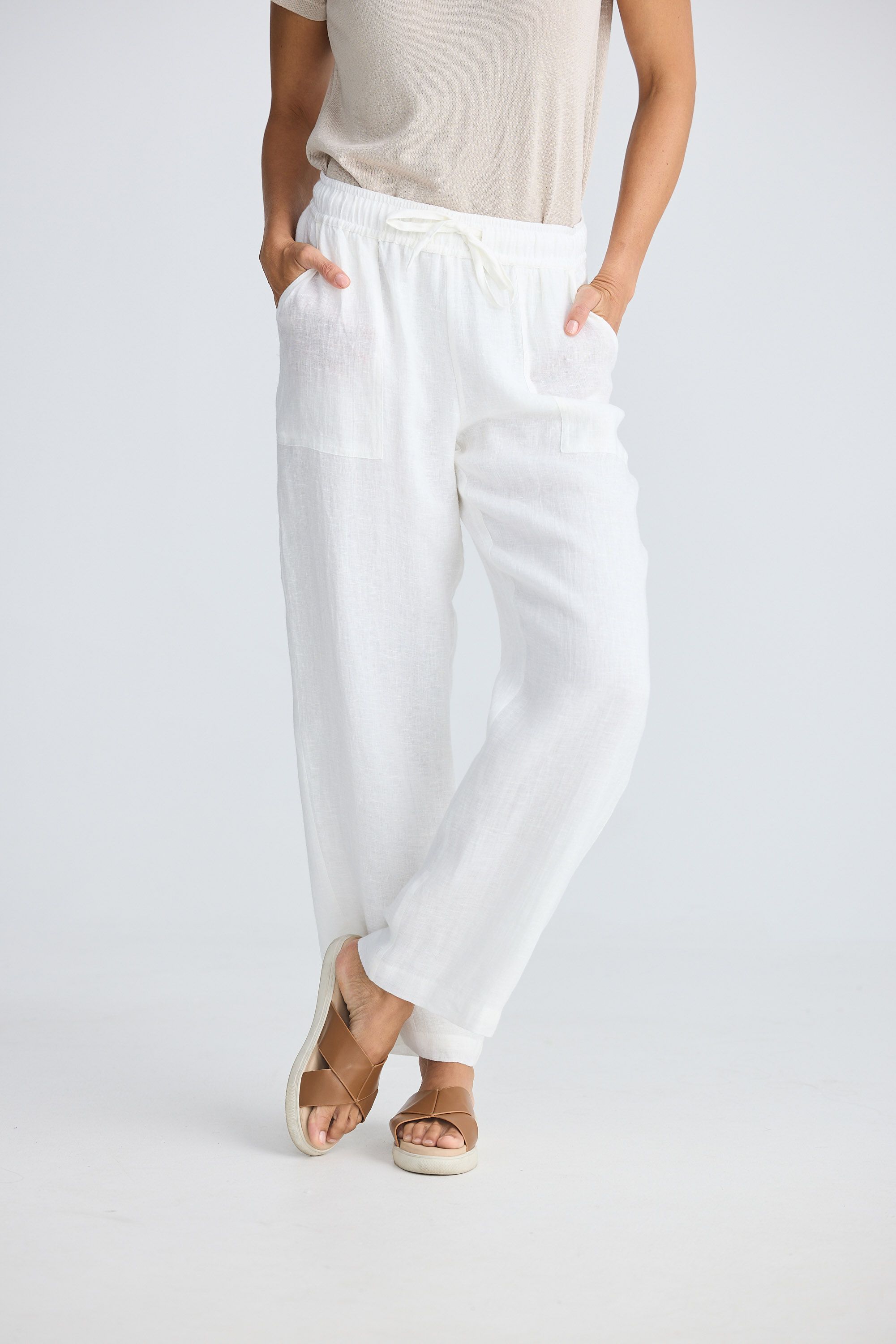 The Marina Pant combines effortless elegance with practical comfort. Crafted from breathable white linen, this full-length style features a relaxed elastic waist with adjustable drawstring for a customizable fit. Functional side pockets add everyday convenience without compromising the refined silhouette. Perfect for warm weather dressing, whether you're heading to the office or weekend gatherings.