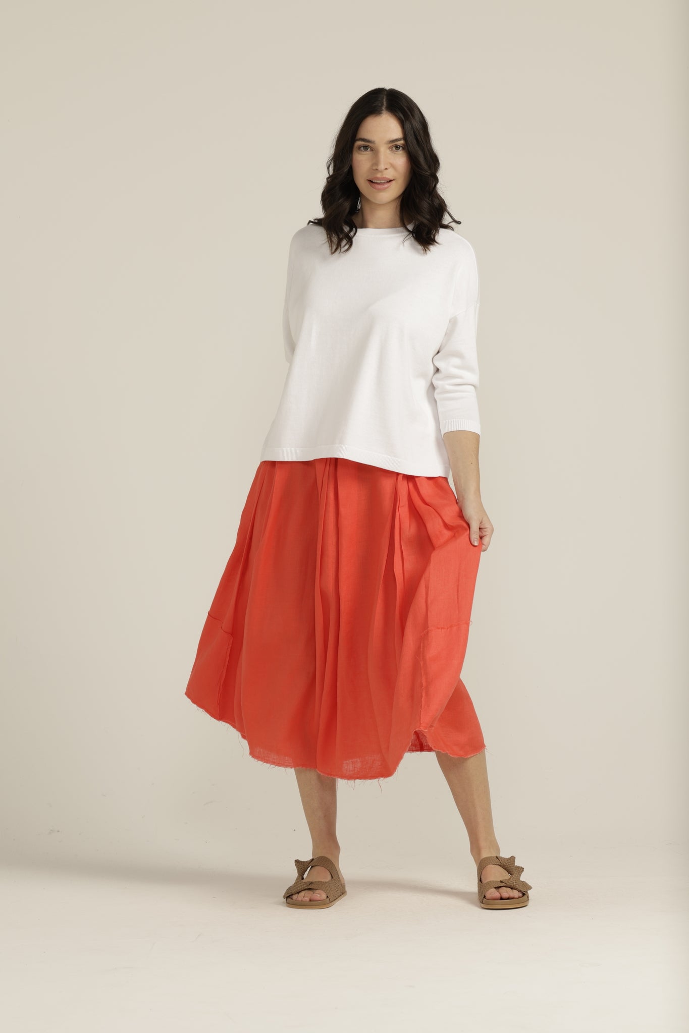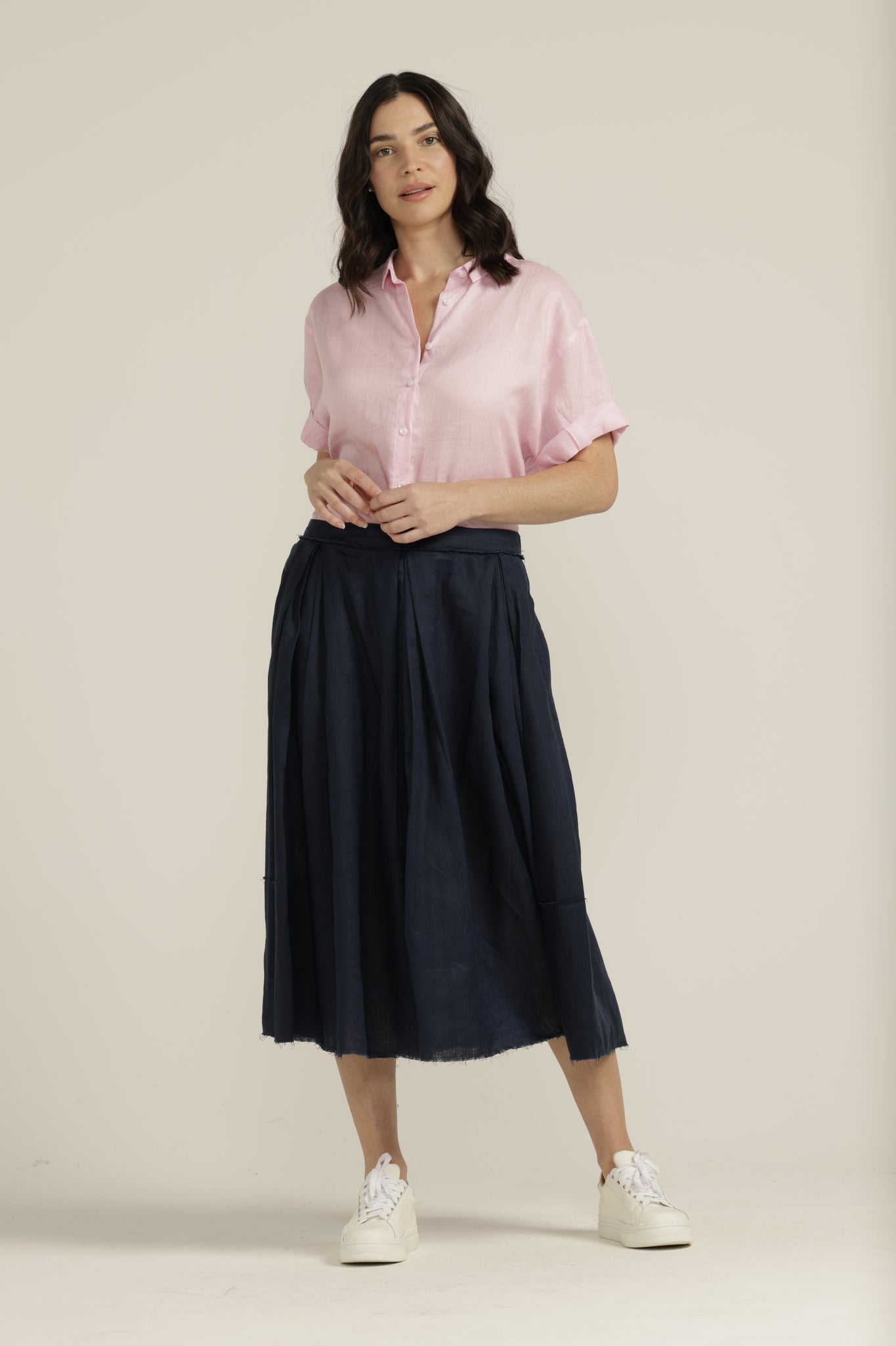 Unleash your inner fashionista with our Pleated Skirt! Made from a unique blend of cloth, paper, and scissors, this 100% linen skirt features a flat front waistband and elasticated back for ultimate comfort. With a side zipper and pockets, and raw edge details on the hem and waistband, it's both functional and stylish. Plus, its relaxed fit gives you the freedom to size down for a more fitted look. Add a playful twist to your wardrobe with this one-of-a-kind skirt.