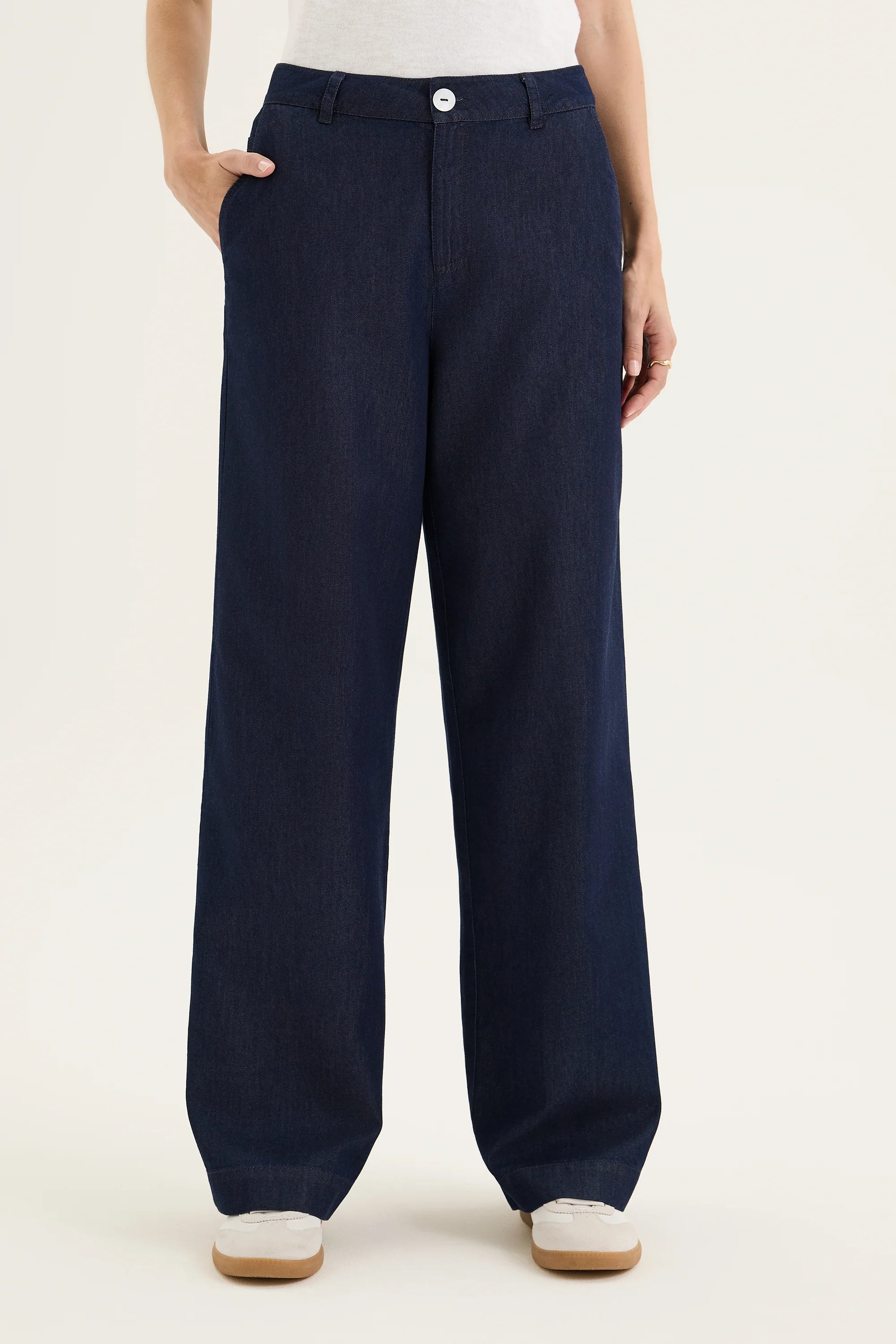 The Vernal Jean blends comfort, movement, and timeless rural style. Made from lightweight stretch denim, it features a high-rise waist, zip and button closure, and wide-leg cut for a flattering, full-length silhouette. Practical details like front slant and back patch pockets keep the look clean and functional. Finished in a dark indigo wash, it's perfect for pairing with knits, shirts, or the matching Vernal Jacket.