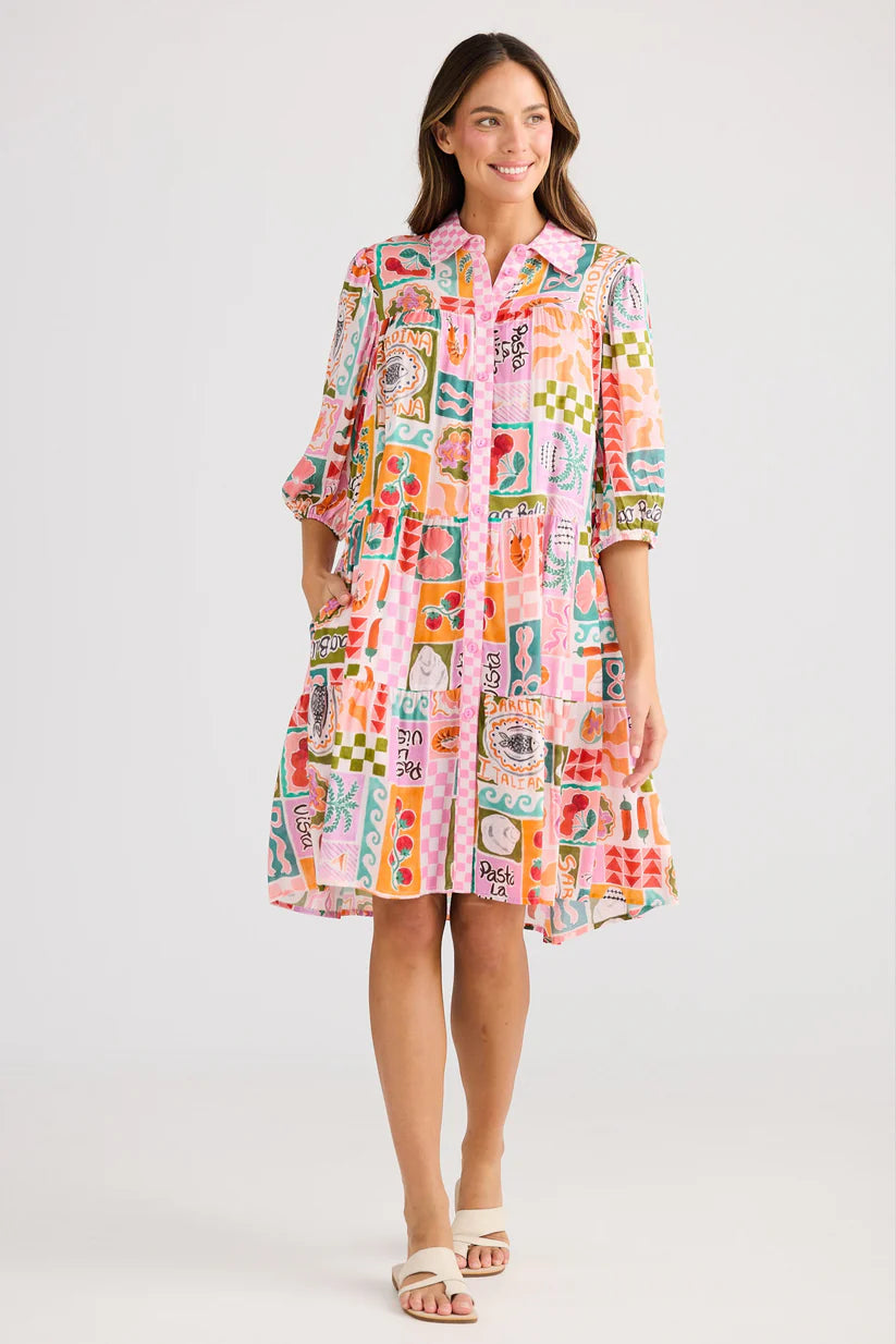 The Fiji Dress in Sardinia Summer Print is your go-to for effortless summer style. Crafted from soft 100% modal, it features a classic collar, front button closure, elasticated mid-length sleeves, and gathered tiers for a relaxed, flowy silhouette. Finished with inseam pockets and a knee-length cut, this dress is lightweight, breathable, and perfect for warm days.