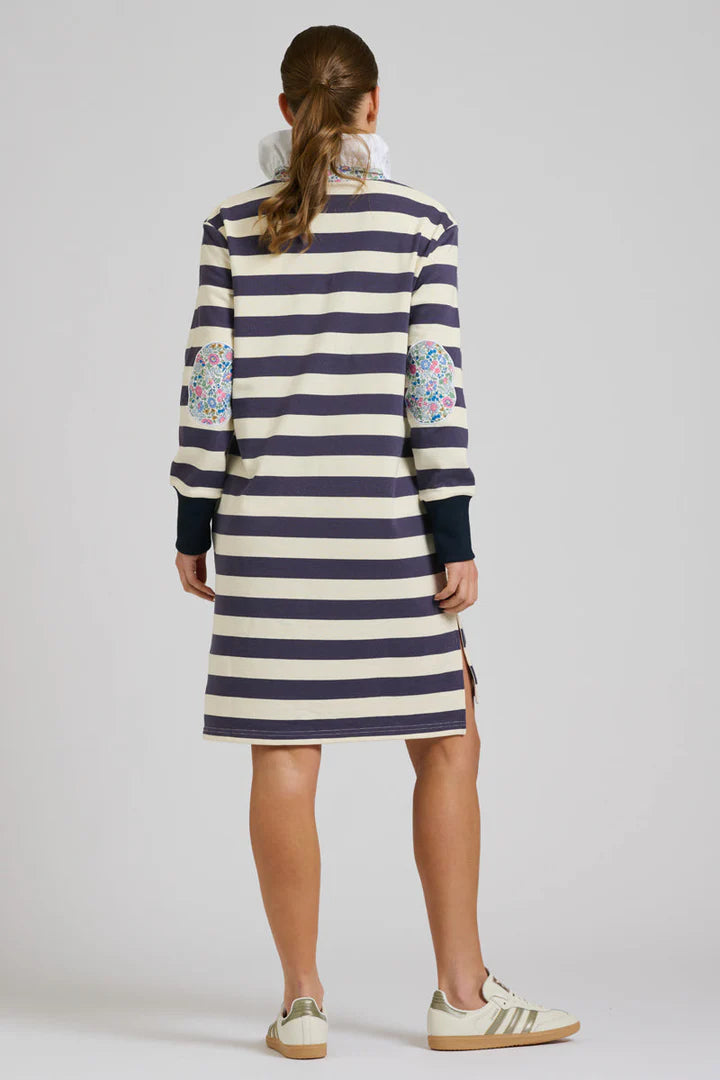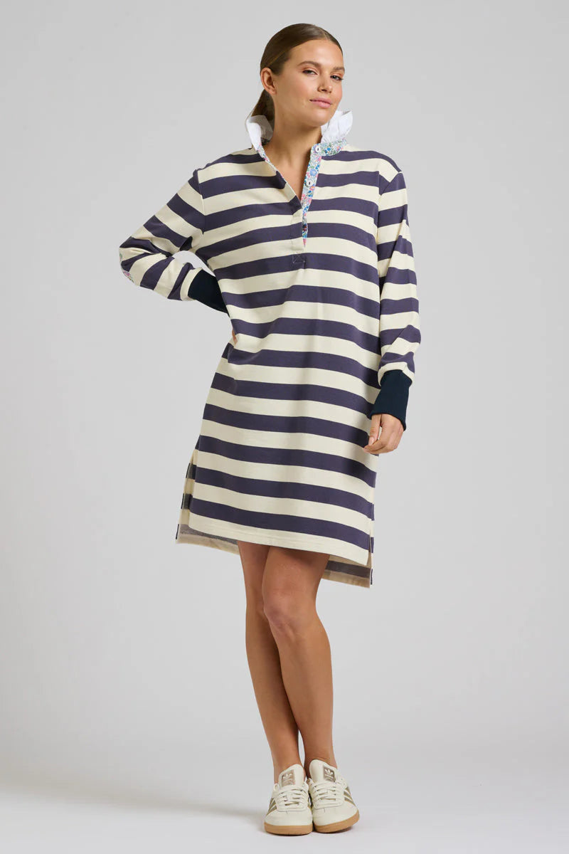 Upgrade your wardrobe with our Rugby Frill Collar Dress! Made with 100% French Terry for a comfortable fit, this dress features a stylish split design and high-low hem. The ruffle collar adds a touch of femininity, while the floral accents on the collar, placket, and elbows provide a unique and chic detail. Don't miss out on this must-have dress!