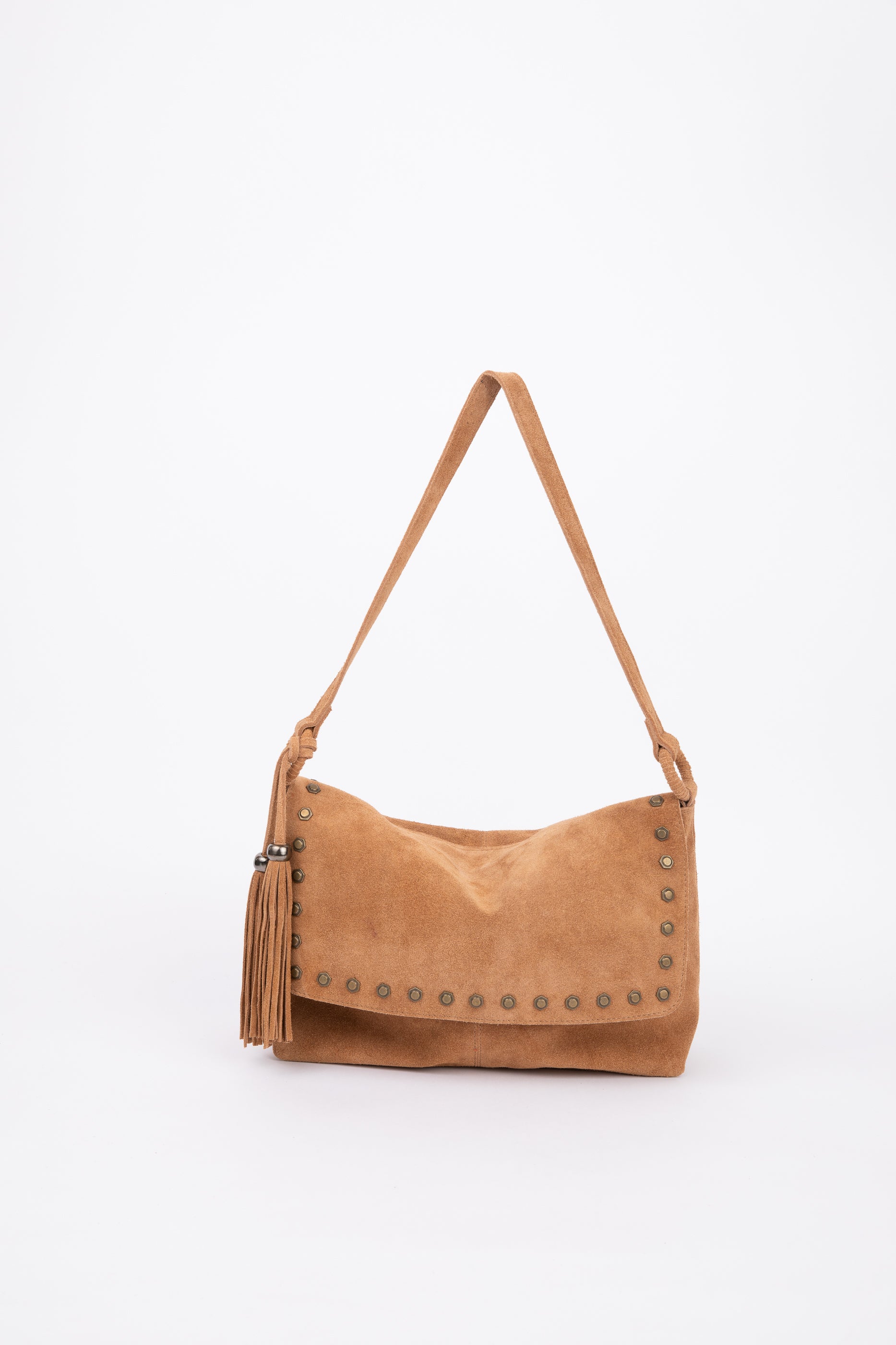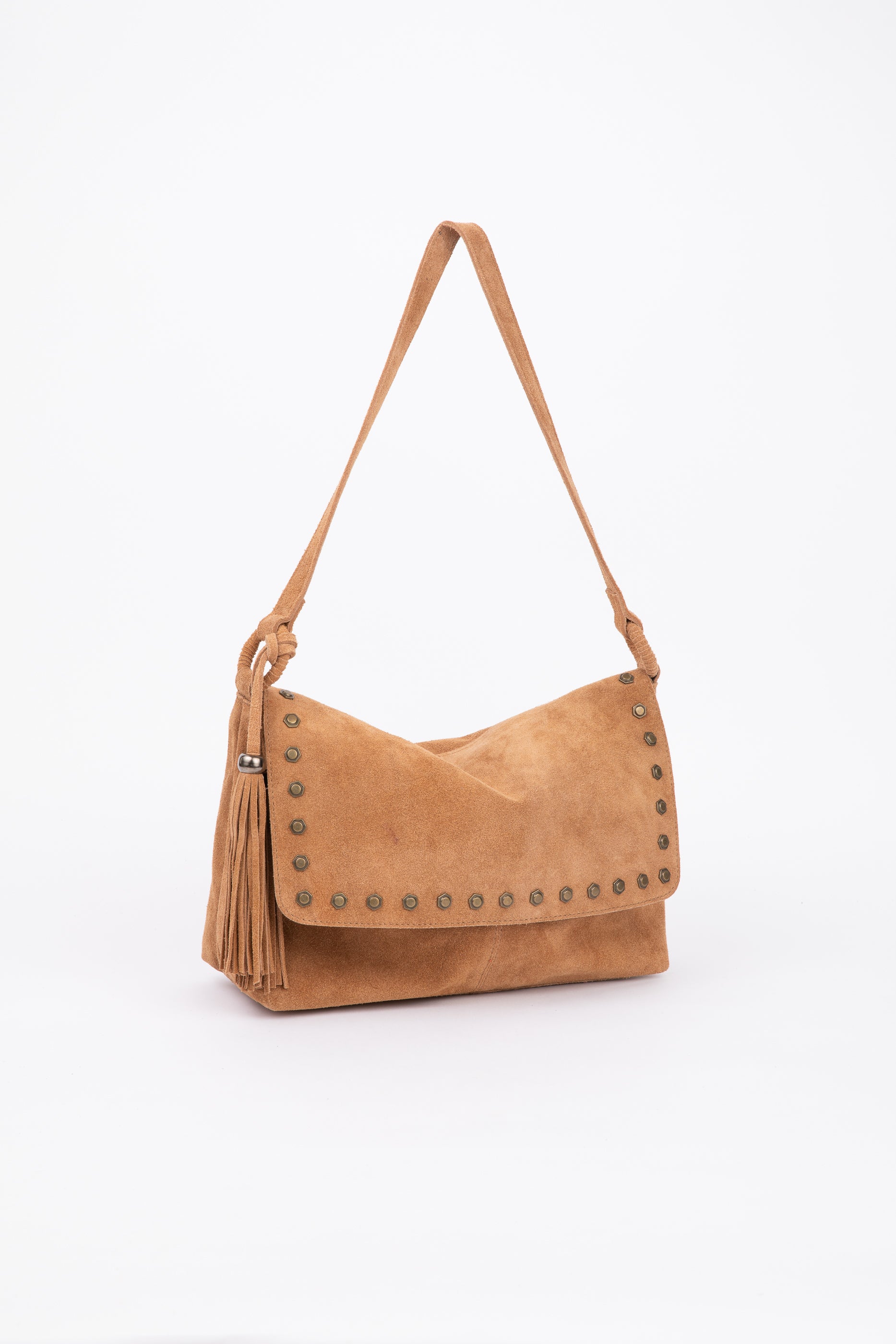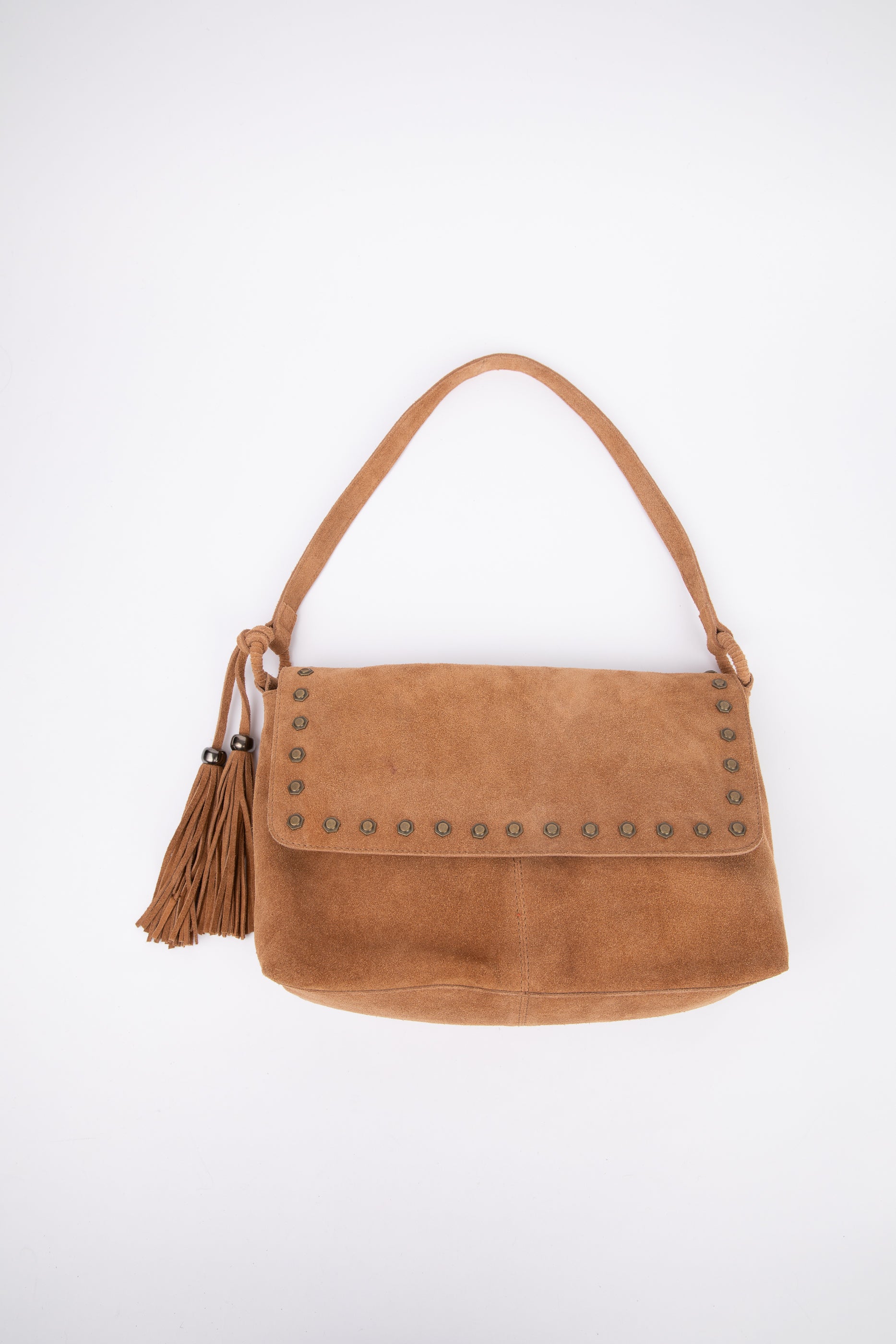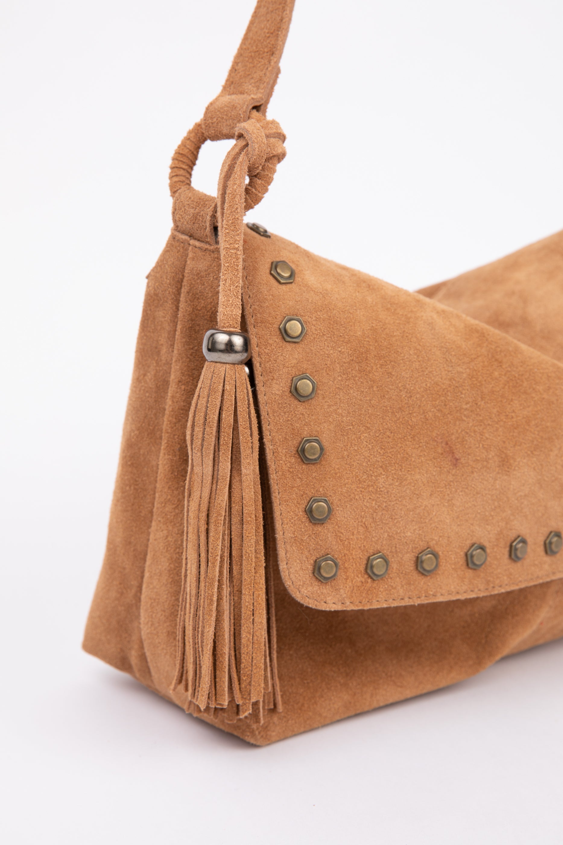 This handcrafted suede clutch is designed with both style and function in mind. Fully lined with soft cotton, it features a secure press-button closure to keep your essentials safe. The stud detailing adds a subtle touch of character, while the boho-inspired tassel gives it a relaxed, effortless feel. Lovingly handmade in India, this piece showcases quality craftsmanship and a timeless design that suits any occasion.