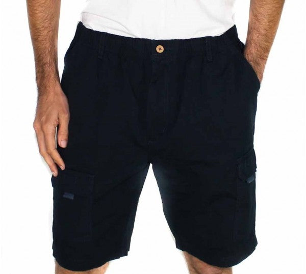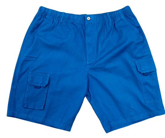 Made from 98% Cotton, 2% Spandex. Elastic waist with button closure and zip fly. Featuring two leg pockets.