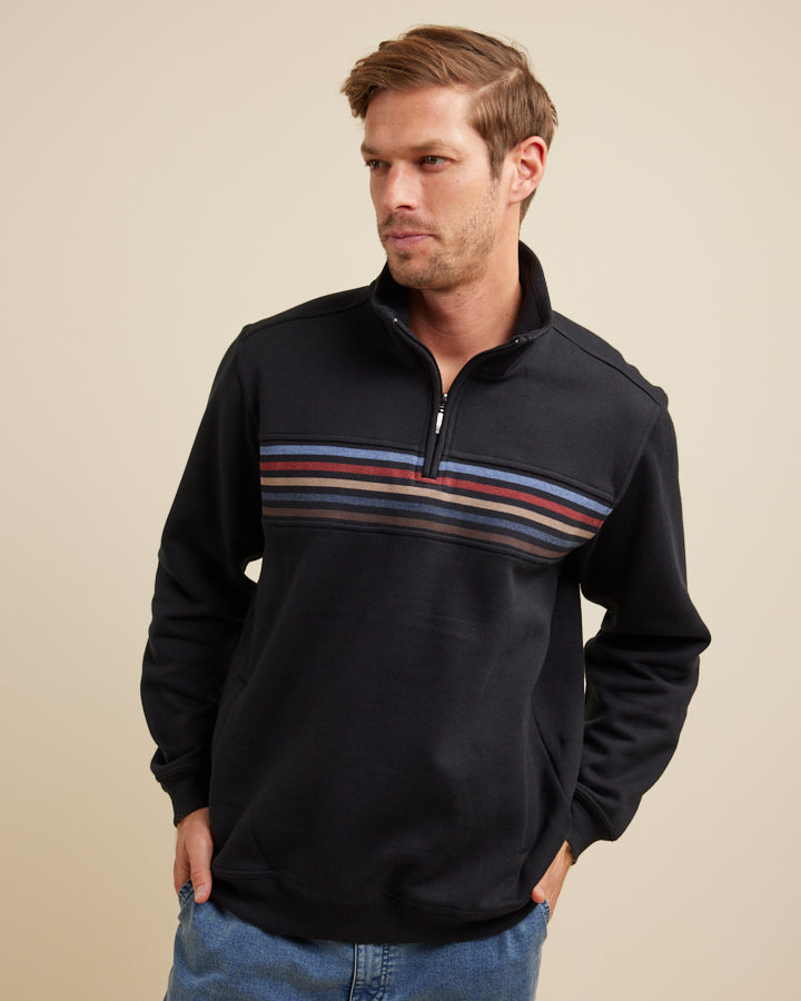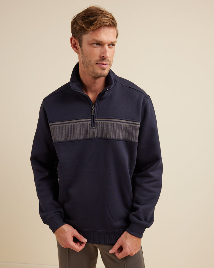 Experience luxury and comfort with Snowy Fleece. Made with premium Snowy Mountain Fleece, this modern half zip sweatshirt features a tonal striped jacquard chest panel and convenient side pockets. Available in this season's key colors, elevate your wardrobe with this high-quality fleece.