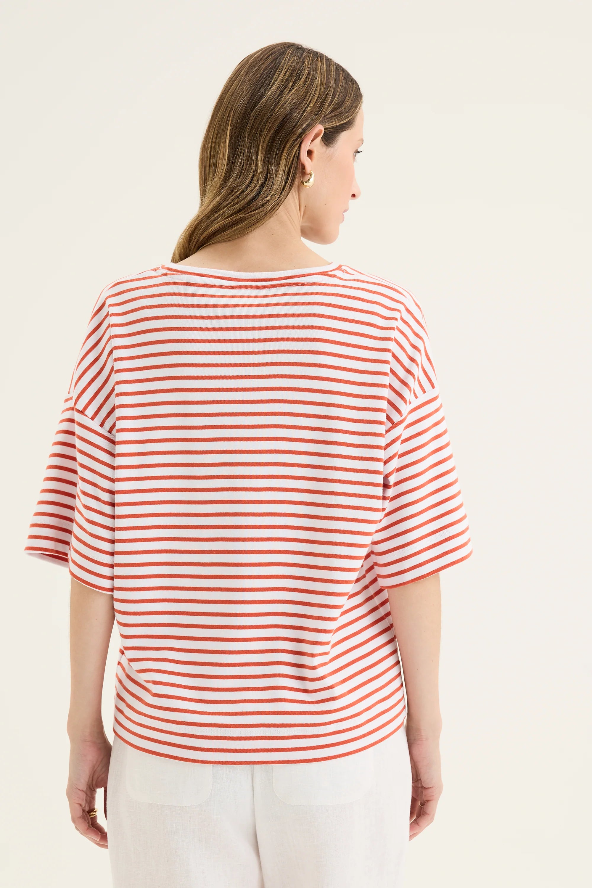 The Banda Tee is your new favourite excuse to skip the plain white tee drawer. Crafted from 100% cotton with yarn-dyed stripes that actually look intentional (not like laundry day went wrong), this relaxed-fit beauty strikes the perfect balance between laid-back comfort and put-together polish. The slightly boxy cut pairs beautifully with the soft drape, while the elbow-length sleeves and round neckline keep things effortlessly flattering. It's the kind of tee that works harder than it looks—equally at home with jeans, linen shorts, or layered under your favourite jacket. Simple, striped, and seriously versatile.