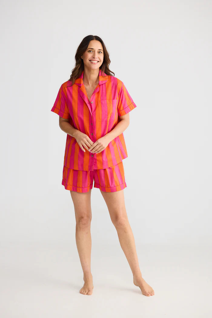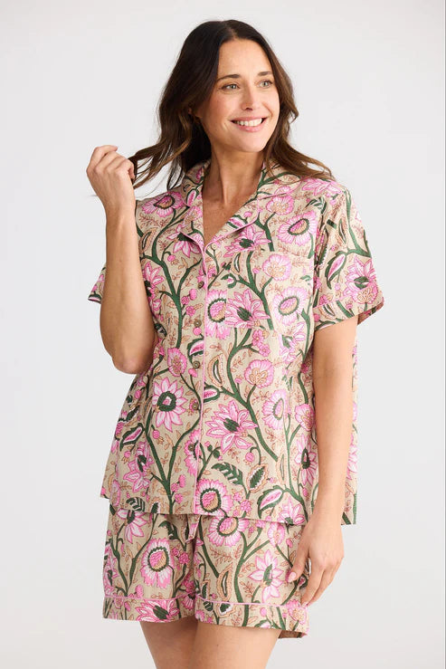 Slip into comfort with the Namaste Pyjama Set – your new favourite way to unwind. This relaxed-fit duo features a button-through shirt paired with matching shorts, complete with elegant piping details and a comfy elasticated waistband. Bonus: a self-fabric drawstring bag keeps everything together, making it perfect for sleepovers or just looking cute while you lounge. Sweet dreams never looked so good!