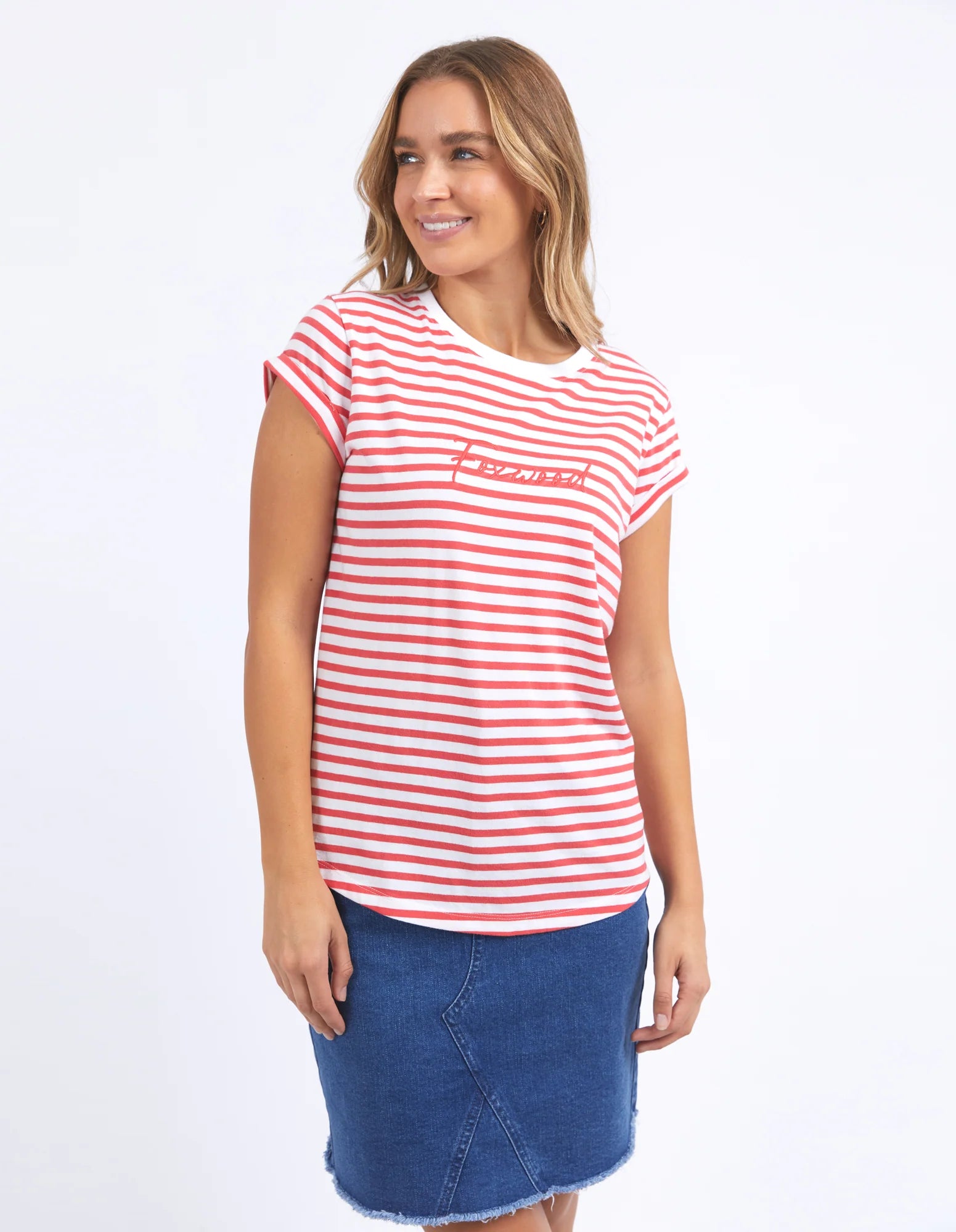 Embrace classic cool with our Signature Stripe Tee, featuring playful embroidered Foxwood artwork on the chest. The rolled cuff sleeves and curved hem add a fun twist to this 100% cotton tee, while yarn-dyed stripes bring subtle texture and style. Perfect for those who like comfort with a dash of personality!