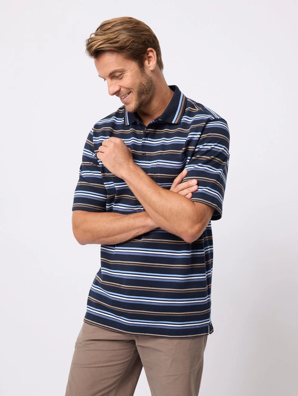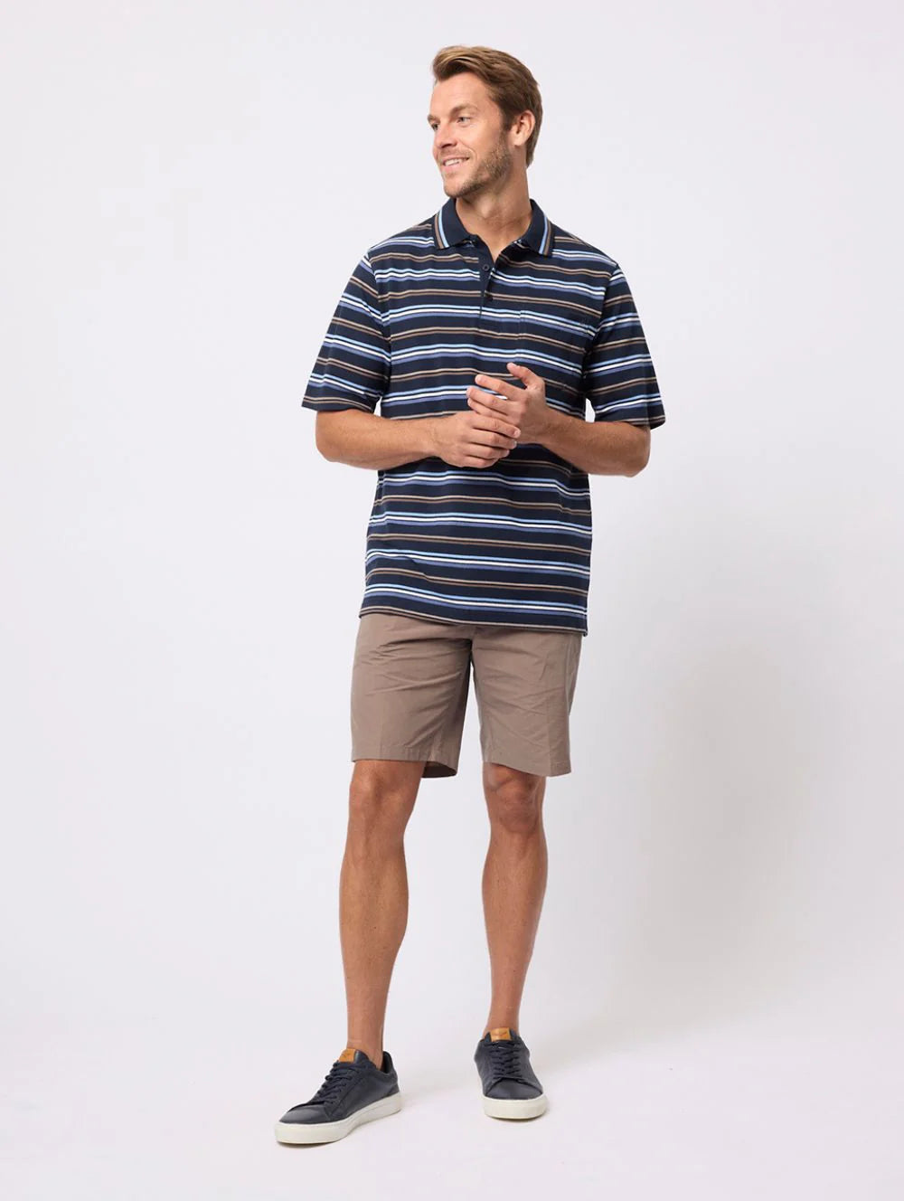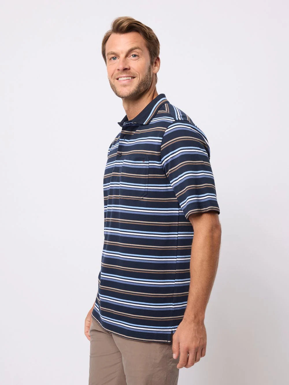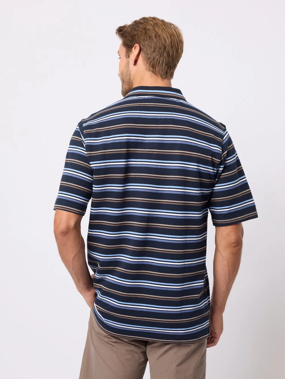 Featuring an ink blue base, the Cormac Cotton Pique Polo is accented with sleek stripes in blue and neutral hues for a sophisticated, understated look. The chest patch pocket adds a touch of practicality, while the ink blue collar is elevated by a refined edge stripe in blue and brown, lending a subtle yet distinctive finish.