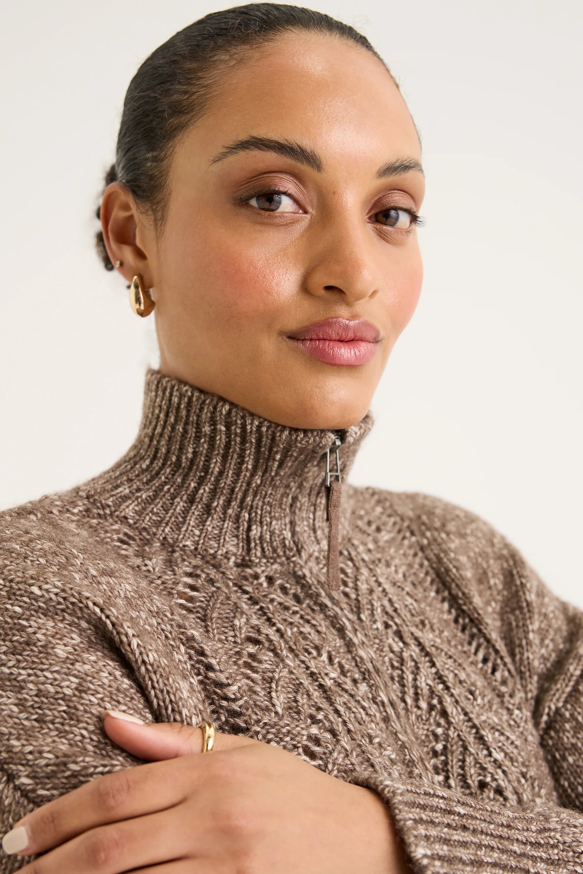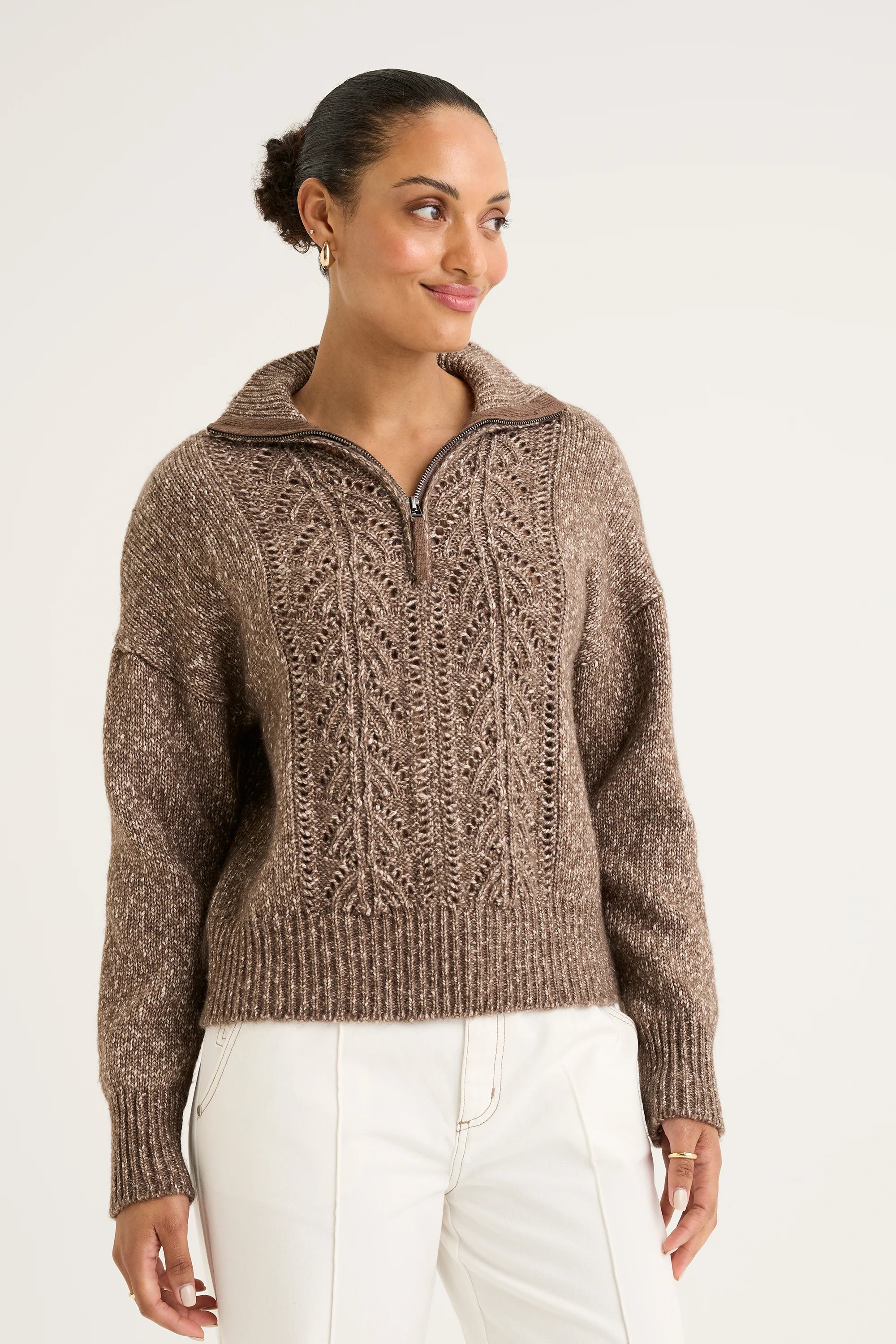 Indulge in luxury with our Vine Knit. The designer pointelle pattern at the front exudes sophistication and comfort. With a turtleneck and quarter zip front, this jumper offers versatile styling options. Pair it with the Briar skirt, jeans, or your favorite bottoms for endless styling possibilities. Elevate your wardrobe with this must-have piece for the season.