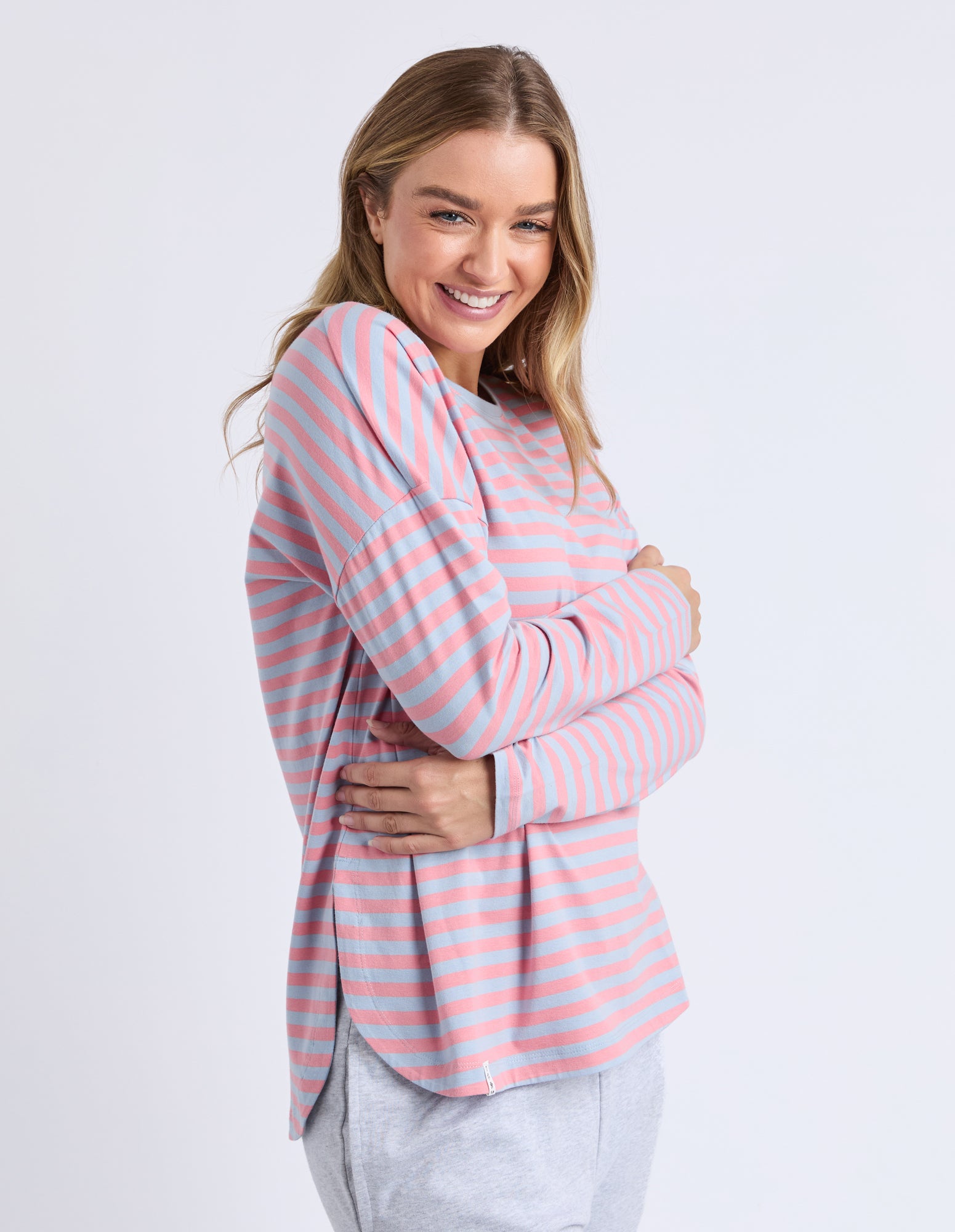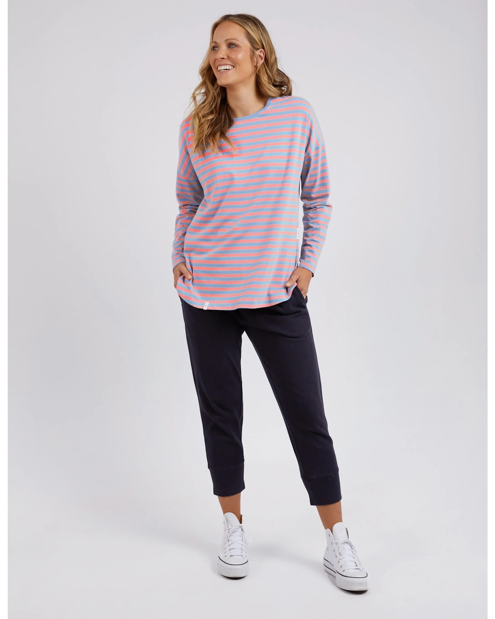 Stay comfy and stylish with the Lauren LS Stripe Tee. Made from cotton elastane jersey, this relaxed fit tee features long sleeves, a crew neckline, and a flattering scooped hemline. Perfect for layering, it's a must-have for any wardrobe. (Don't forget your trackies or denim!)