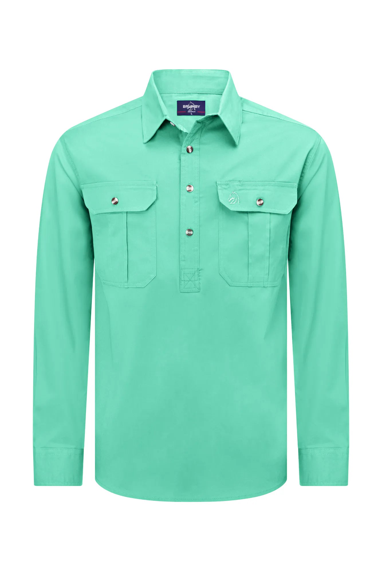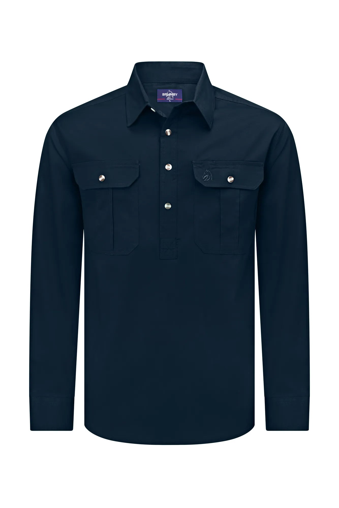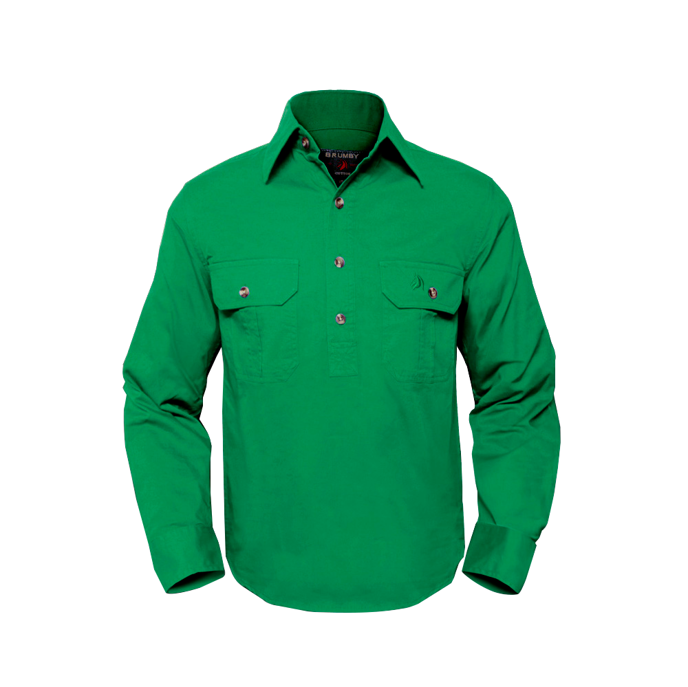 The Brumby Workshirt combines rugged durability with everyday comfort. Crafted from 100% cotton with a soft peach finish and garment-washed for enhanced softness, this long-sleeve shirt delivers UPF 50+ sun protection for outdoor work. The half-buttoned placket ensures workplace safety, while long cuffs fold easily for versatility. A back pleat and extended tail provide unrestricted movement, complemented by double-pocket design with buttoned flaps. Built tough with double stitching and 160gsm fabric weight, it resists tearing and maintains its integrity through years of wear.